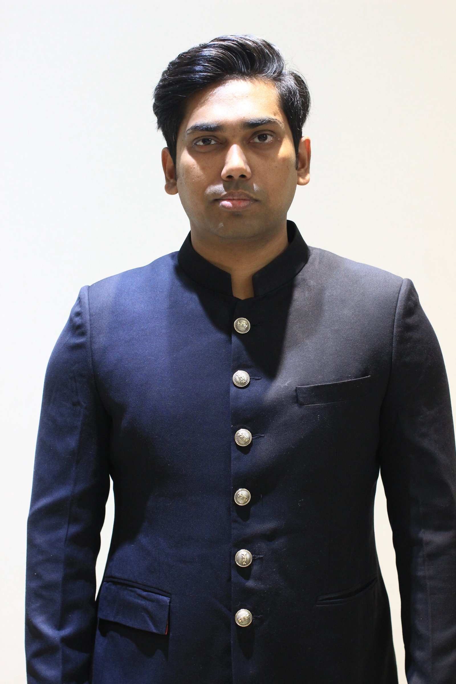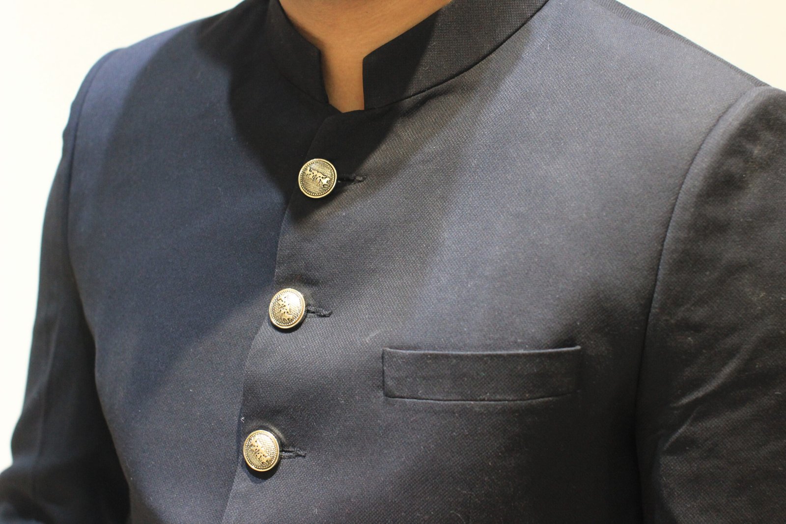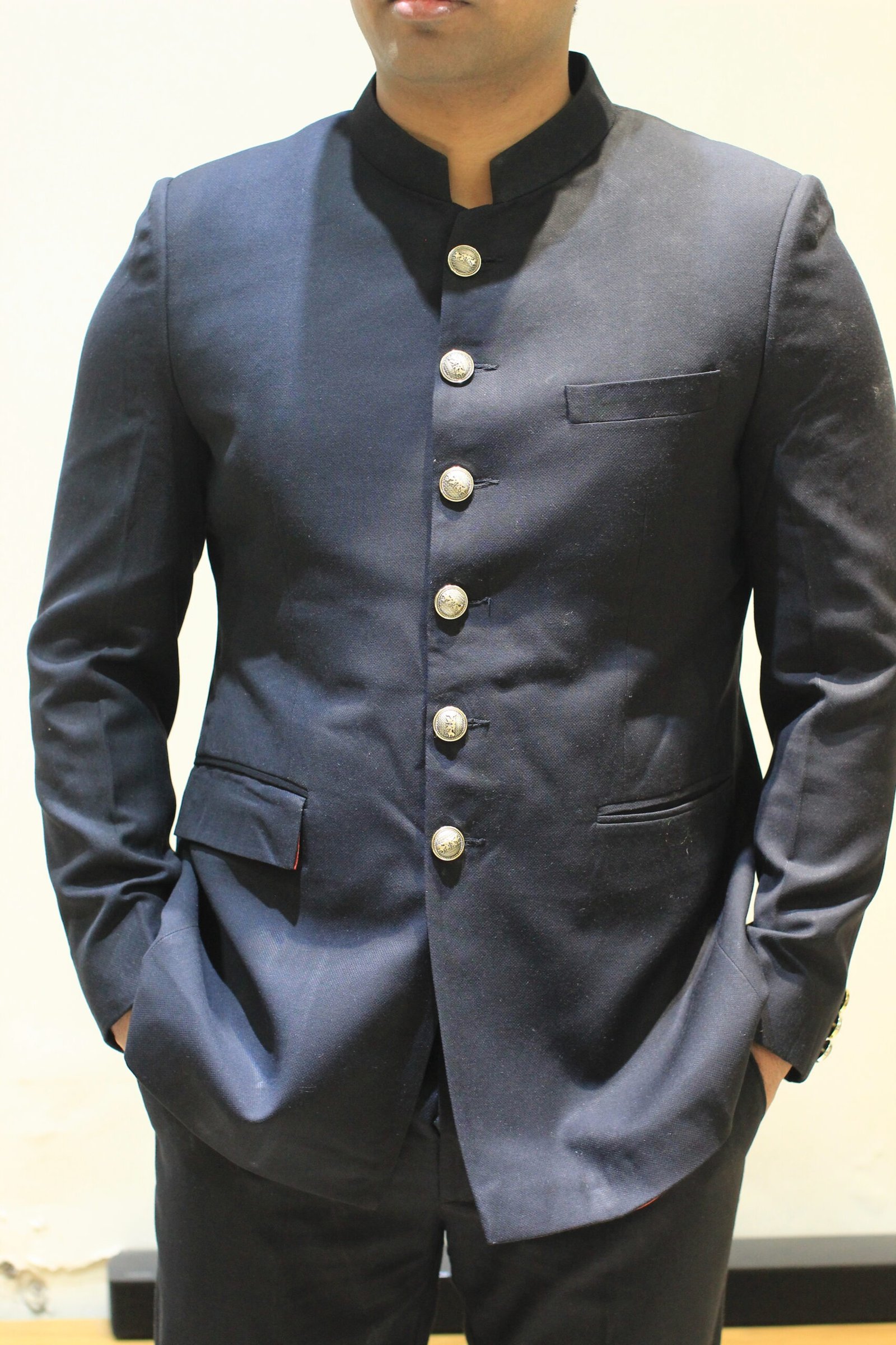 This Jodhpuri-style black suit is crafted from premium wool blend fabric, offering both durability and comfort. The material has slight stretchability for a tailored fit, enhanced by golden buttons for a luxurious finish. Perfect for formal events or weddings.