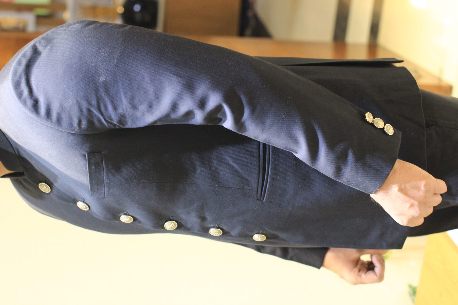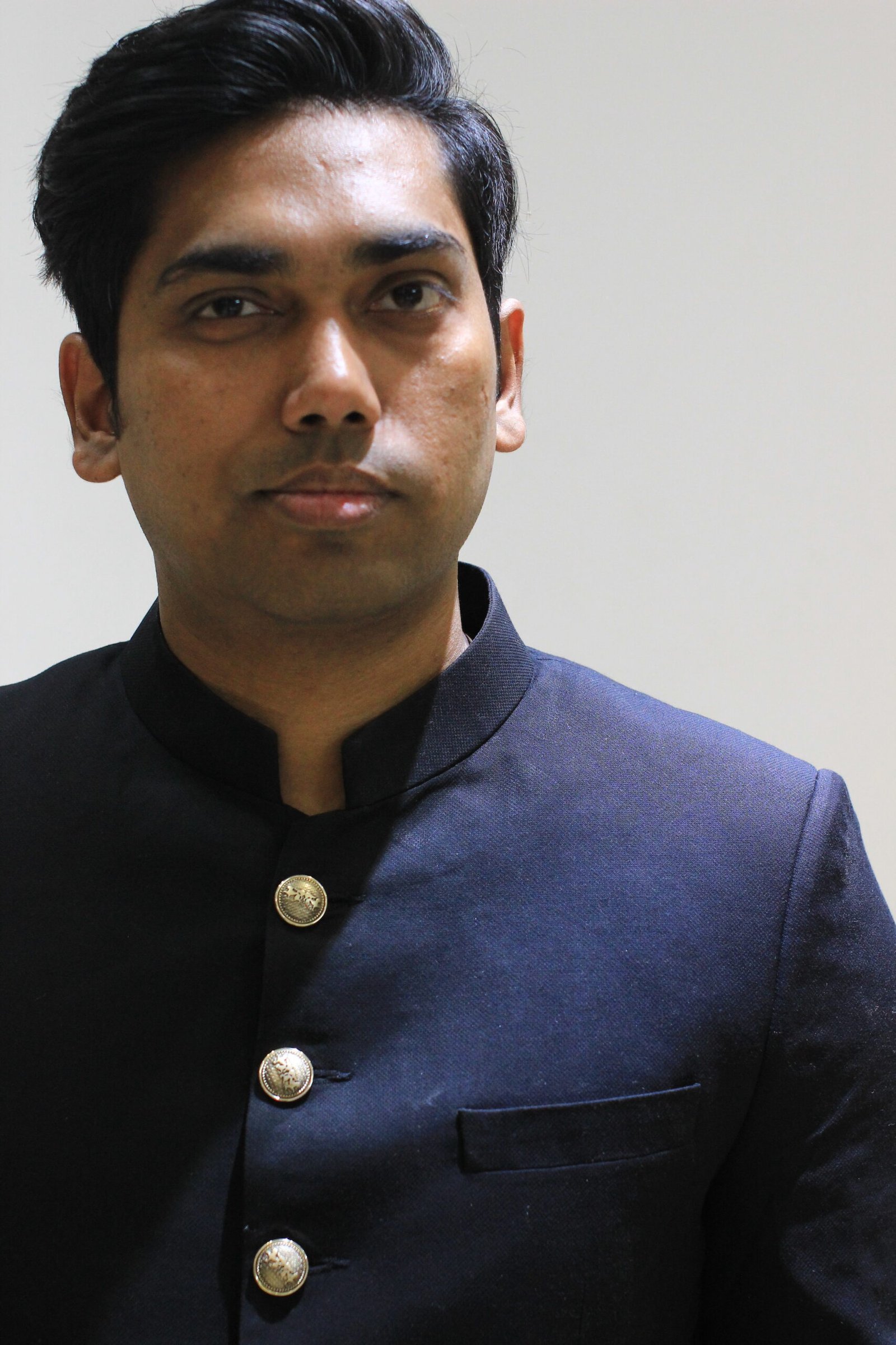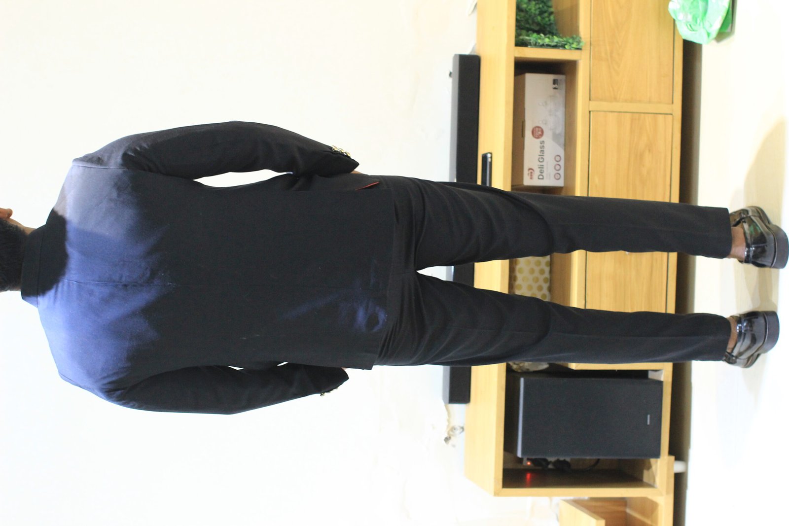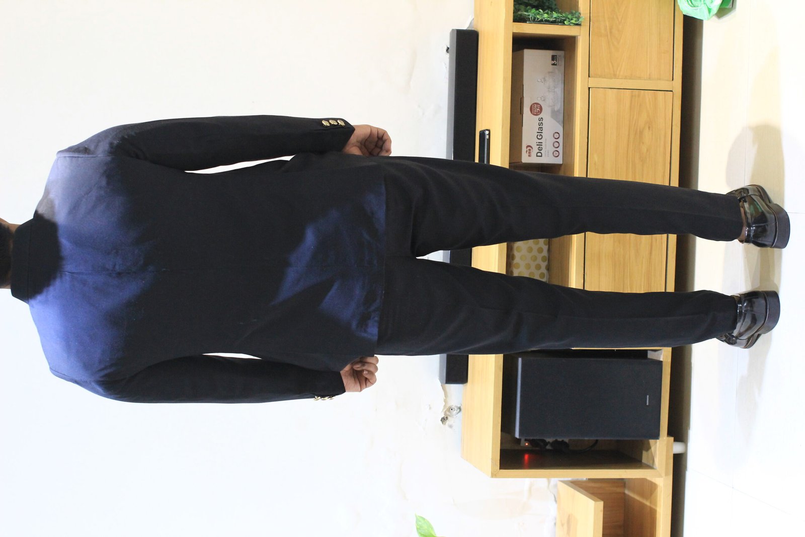 This Jodhpuri-style black suit is crafted from premium wool blend fabric, offering both durability and comfort. The material has slight stretchability for a tailored fit, enhanced by golden buttons for a luxurious finish. Perfect for formal events or weddings.